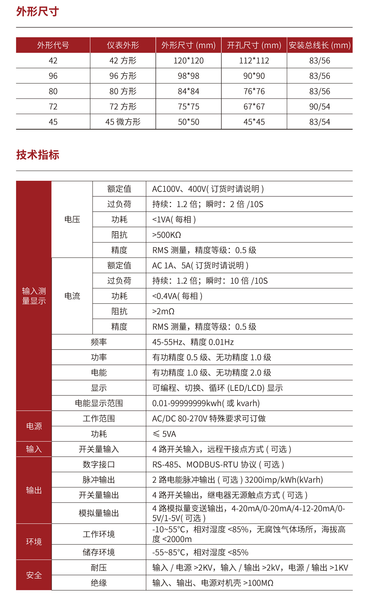 多功能电力仪表是一种具有可编程测量、显示、数字通讯和电能脉冲输出等功能的多功能电力仪表,能够完成电量测量、电能计量、数据显示、采集及传输,能够高精度测量三相电网系统中常用的电量参数: 三相电流、电压、电流、总有功功率、总无功功率、功率因数、总视在功率、频率、分相有/ 无功功率、分相功率因数、 有功电能、无功电能,并带有通讯接口,可实现本地或远程的开关信号检测和控制功能。采用标准的 RS485 MODBUSRTU通讯协议 , 实现LED/LCD 现场显示和远程RS-485 数字通讯。